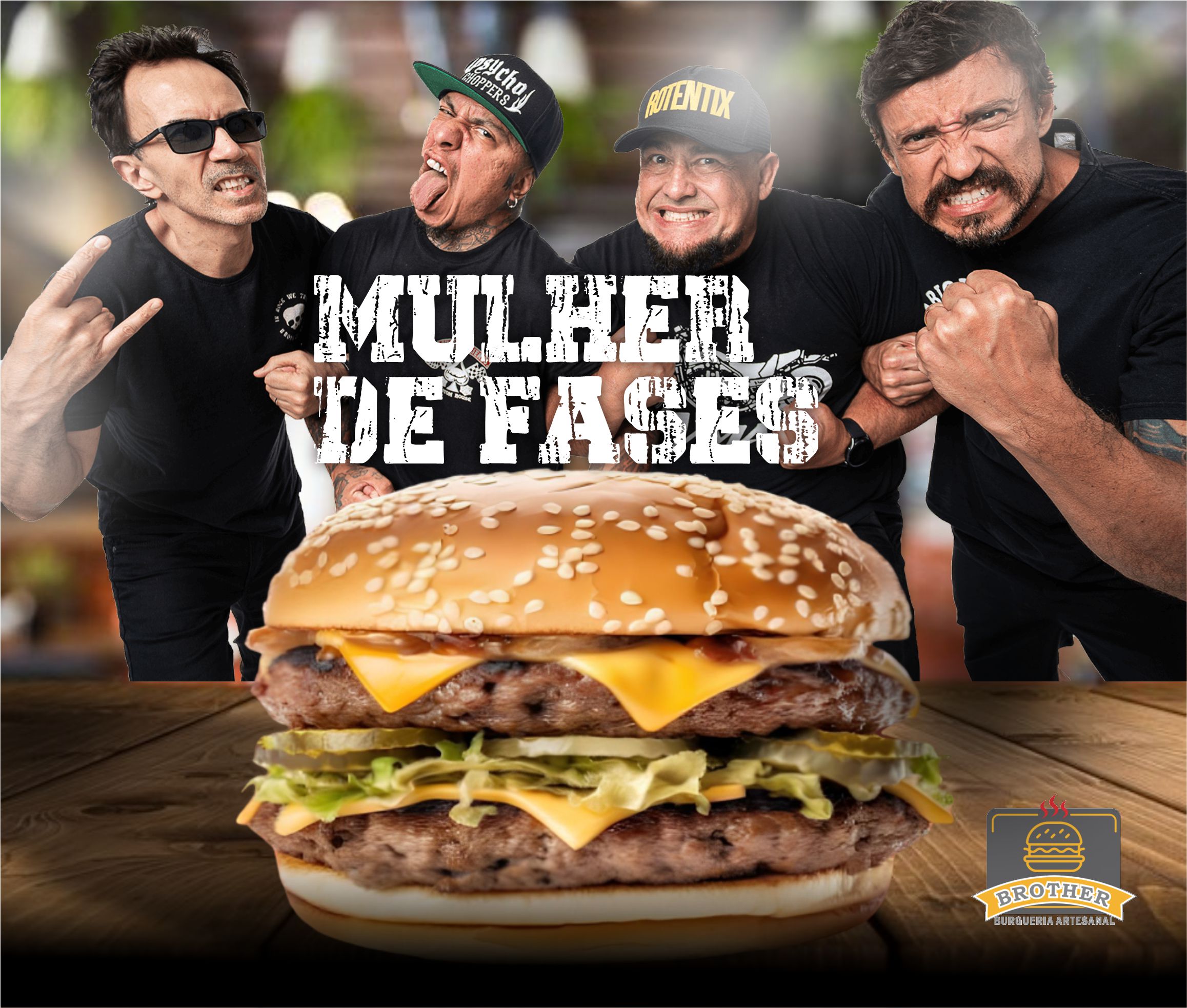 (Pão brioche, duplo smash de 100g, toscana, bovino, tira bacon, creme chesse, molho brother, alface e tomate)
